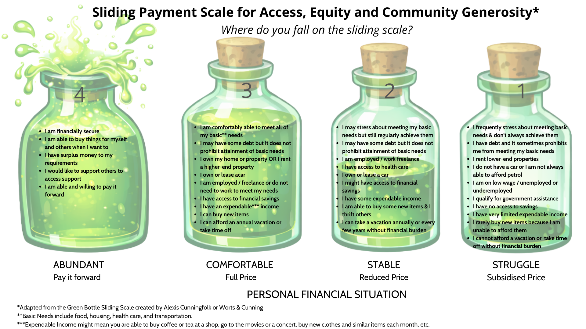 Image adapted from Worts and Cumming's green bottle sliding scaleSliding Scale that supports principles of Access, Equity and Community Generosity